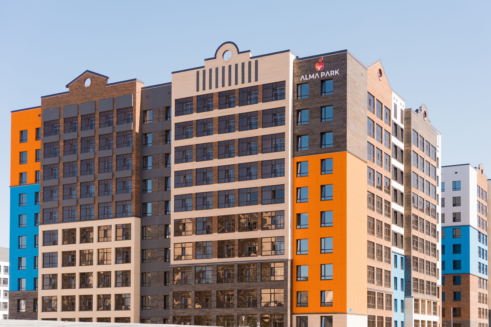 Alma Park is a modern residential complex located in the heart of the developed part of the left bank, at the intersection of Turan and Kerey-Zhanibek Khandar streets. Enjoying life within the walls of your home, you unfold the beauty in every detail. A colorful and unusual facade, thoughtful layouts, a landscaped courtyard, and creative halls bring bright colors to everyday life.